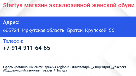 Startys, магазин эксклюзивной женской обуви по адресу 665724, Иркутская область, Братск, Крупской, 56 в дальнейшем Организация, размещена в следующих категориях: