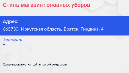 Стиль, магазин головных уборов по адресу 665730, Иркутская область, Братск, Гиндина, 4 в дальнейшем Организация, размещена в следующих категориях: