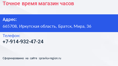 Точное время, магазин часов по адресу 665708, Иркутская область, Братск, Мира, 36 в дальнейшем Организация, размещена в следующих категориях: