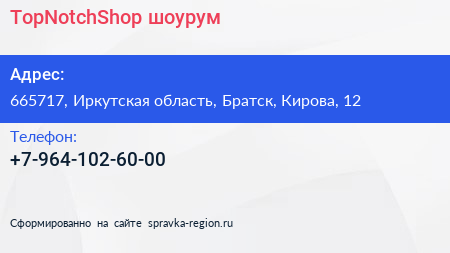 TopNotchShop, шоурум по адресу 665717, Иркутская область, Братск, Кирова, 12 в дальнейшем Организация, размещена в следующих категориях: