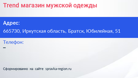 Trend, магазин мужской одежды по адресу 665730, Иркутская область, Братск, Юбилейная, 51 в дальнейшем Организация, размещена в следующих категориях: