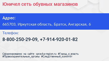 Юничел, сеть обувных магазинов по адресу 665703, Иркутская область, Братск, Ангарская, 6 в дальнейшем Организация, размещена в следующих категориях: