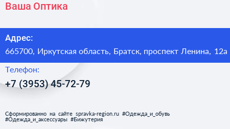 Ваша Оптика по адресу 665700, Иркутская область, Братск, проспект Ленина, 12а в дальнейшем Организация, размещена в следующих категориях: