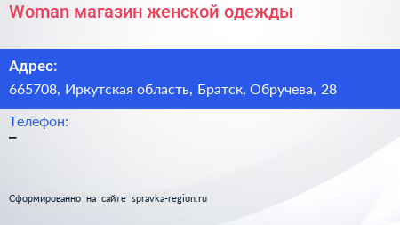 Woman, магазин женской одежды по адресу 665708, Иркутская область, Братск, Обручева, 28 в дальнейшем Организация, размещена в следующих категориях: