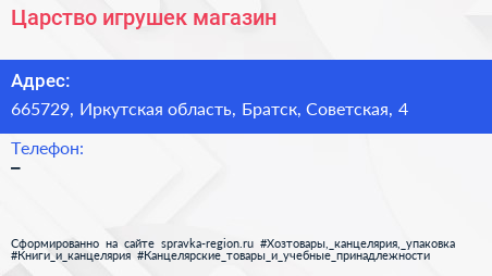 Царство игрушек, магазин по адресу 665729, Иркутская область, Братск, Советская, 4 в дальнейшем Организация, размещена в следующих категориях: