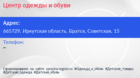 Центр одежды и обуви по адресу 665729, Иркутская область, Братск, Советская, 15 в дальнейшем Организация, размещена в следующих категориях: