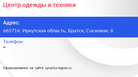 Центр одежды и техники по адресу 665714, Иркутская область, Братск, Сосновая, 6 в дальнейшем Организация, размещена в следующих категориях:
