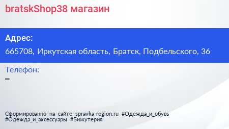 bratskShop38, магазин по адресу 665708, Иркутская область, Братск, Подбельского, 36 в дальнейшем Организация, размещена в следующих категориях: