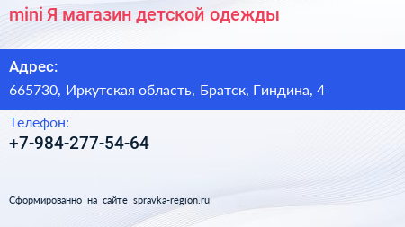 mini Я, магазин детской одежды по адресу 665730, Иркутская область, Братск, Гиндина, 4 в дальнейшем Организация, размещена в следующих категориях: