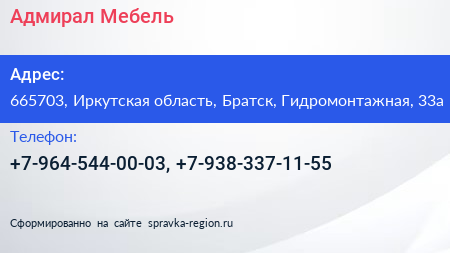 Адмирал Мебель по адресу 665703, Иркутская область, Братск, Гидромонтажная, 33а в дальнейшем Организация, размещена в следующих категориях: