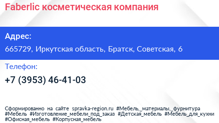 Faberlic, косметическая компания по адресу 665729, Иркутская область, Братск, Советская, 6 в дальнейшем Организация, размещена в следующих категориях: