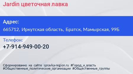 Jardin, цветочная лавка по адресу 665712, Иркутская область, Братск, Мамырская, 99Б в дальнейшем Организация, размещена в следующих категориях: