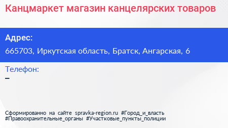 Канцмаркет, магазин канцелярских товаров по адресу 665703, Иркутская область, Братск, Ангарская, 6 в дальнейшем Организация, размещена в следующих категориях: