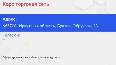 Карс, торговая сеть по адресу 665708, Иркутская область, Братск, Обручева, 28 в дальнейшем Организация, размещена в следующих категориях: