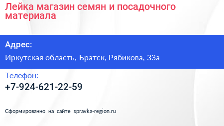 Лейка, магазин семян и посадочного материала по адресу Иркутская область, Братск, Рябикова, 33а в дальнейшем Организация, размещена в следующих категориях: