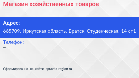 Магазин хозяйственных товаров по адресу 665709, Иркутская область, Братск, Студенческая, 14 ст1 в дальнейшем Организация, размещена в следующих категориях: