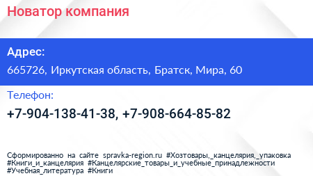 Новатор, компания по адресу 665726, Иркутская область, Братск, Мира, 60 в дальнейшем Организация, размещена в следующих категориях: