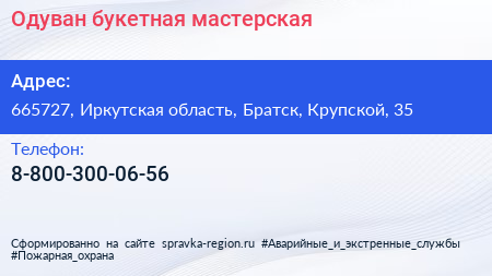Одуван, букетная мастерская по адресу 665727, Иркутская область, Братск, Крупской, 35 в дальнейшем Организация, размещена в следующих категориях: