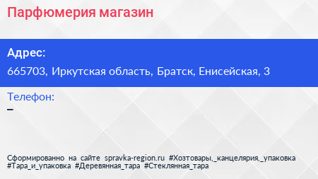 Парфюмерия, магазин по адресу 665703, Иркутская область, Братск, Енисейская, 3 в дальнейшем Организация, размещена в следующих категориях: