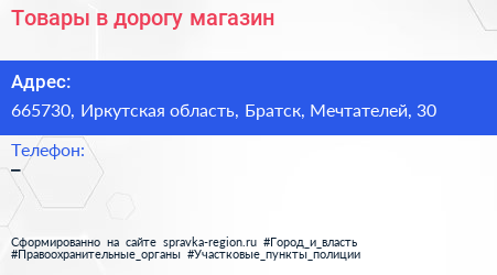 Товары в дорогу, магазин по адресу 665730, Иркутская область, Братск, Мечтателей, 30 в дальнейшем Организация, размещена в следующих категориях: