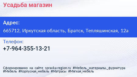 Усадьба, магазин по адресу 665712, Иркутская область, Братск, Тепляшинская, 12а в дальнейшем Организация, размещена в следующих категориях: