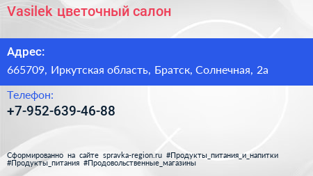 Vasilek, цветочный салон по адресу 665709, Иркутская область, Братск, Солнечная, 2а в дальнейшем Организация, размещена в следующих категориях: