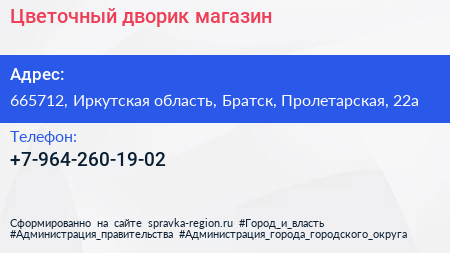 Цветочный дворик, магазин по адресу 665712, Иркутская область, Братск, Пролетарская, 22а в дальнейшем Организация, размещена в следующих категориях: