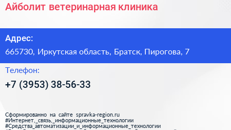 Айболит, ветеринарная клиника по адресу 665730, Иркутская область, Братск, Пирогова, 7 в дальнейшем Организация, размещена в следующих категориях: