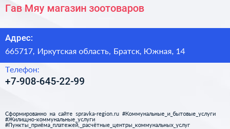 Гав & Мяу, магазин зоотоваров по адресу 665717, Иркутская область, Братск, Южная, 14 в дальнейшем Организация, размещена в следующих категориях: