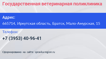 Государственная ветеринарная поликлиника по адресу 665714, Иркутская область, Братск, Мало-Амурская, 15 в дальнейшем Организация, размещена в следующих категориях: