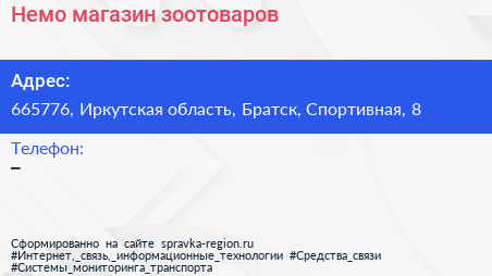 Немо, магазин зоотоваров по адресу 665776, Иркутская область, Братск, Спортивная, 8 в дальнейшем Организация, размещена в следующих категориях: