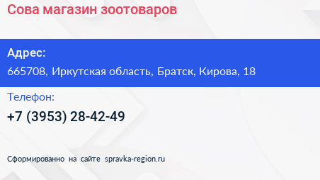 Сова, магазин зоотоваров по адресу 665708, Иркутская область, Братск, Кирова, 18 в дальнейшем Организация, размещена в следующих категориях: