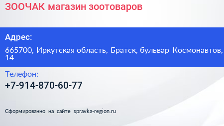 ЗООЧАК, магазин зоотоваров по адресу 665700, Иркутская область, Братск, бульвар Космонавтов, 14 в дальнейшем Организация, размещена в следующих категориях: