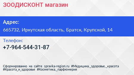 ЗООДИСКОНТ, магазин по адресу 665732, Иркутская область, Братск, Крупской, 14 в дальнейшем Организация, размещена в следующих категориях: