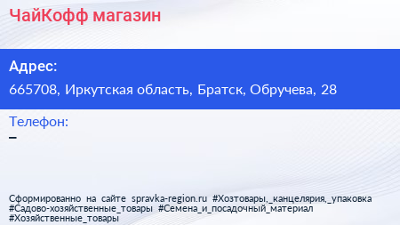 ЧайКофф, магазин по адресу 665708, Иркутская область, Братск, Обручева, 28 в дальнейшем Организация, размещена в следующих категориях: