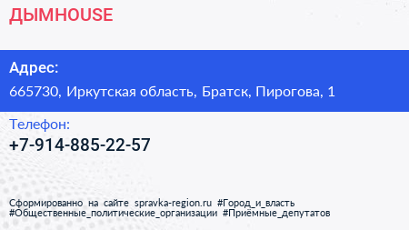 ДЫМHOUSE по адресу 665730, Иркутская область, Братск, Пирогова, 1 в дальнейшем Организация, размещена в следующих категориях: