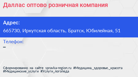 Даллас, оптово-розничная компания по адресу 665730, Иркутская область, Братск, Юбилейная, 51 в дальнейшем Организация, размещена в следующих категориях: