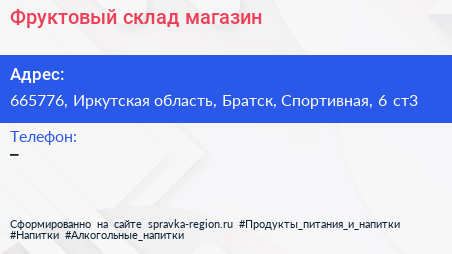 Фруктовый склад, магазин по адресу 665776, Иркутская область, Братск, Спортивная, 6 ст3 в дальнейшем Организация, размещена в следующих категориях: