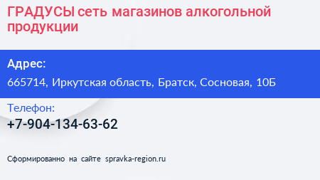 ГРАДУСЫ, сеть магазинов алкогольной продукции по адресу 665714, Иркутская область, Братск, Сосновая, 10Б в дальнейшем Организация, размещена в следующих категориях: