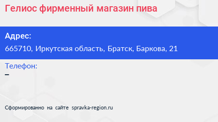 Гелиос, фирменный магазин пива по адресу 665710, Иркутская область, Братск, Баркова, 21 в дальнейшем Организация, размещена в следующих категориях: