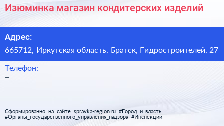 Изюминка, магазин кондитерских изделий по адресу 665712, Иркутская область, Братск, Гидростроителей, 27 в дальнейшем Организация, размещена в следующих категориях: