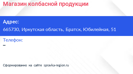 Магазин колбасной продукции по адресу 665730, Иркутская область, Братск, Юбилейная, 51 в дальнейшем Организация, размещена в следующих категориях:
