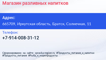 Магазин разливных напитков по адресу 665709, Иркутская область, Братск, Солнечная, 11 в дальнейшем Организация, размещена в следующих категориях: