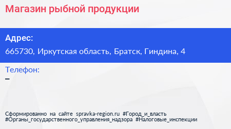 Магазин рыбной продукции по адресу 665730, Иркутская область, Братск, Гиндина, 4 в дальнейшем Организация, размещена в следующих категориях: