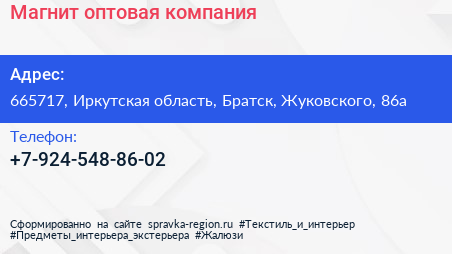 Магнит, оптовая компания по адресу 665717, Иркутская область, Братск, Жуковского, 86а в дальнейшем Организация, размещена в следующих категориях: