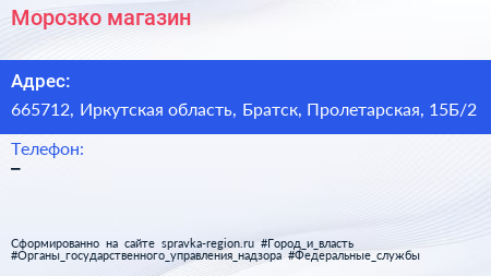 Морозко, магазин по адресу 665712, Иркутская область, Братск, Пролетарская, 15Б/2 в дальнейшем Организация, размещена в следующих категориях:
