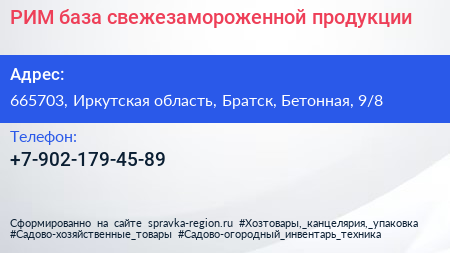РИМ, база свежезамороженной продукции по адресу 665703, Иркутская область, Братск, Бетонная, 9/8 в дальнейшем Организация, размещена в следующих категориях: