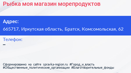 Рыбка моя, магазин морепродуктов по адресу 665717, Иркутская область, Братск, Комсомольская, 62 в дальнейшем Организация, размещена в следующих категориях: