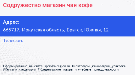 Содружество, магазин чая, кофе по адресу 665717, Иркутская область, Братск, Южная, 12 в дальнейшем Организация, размещена в следующих категориях: