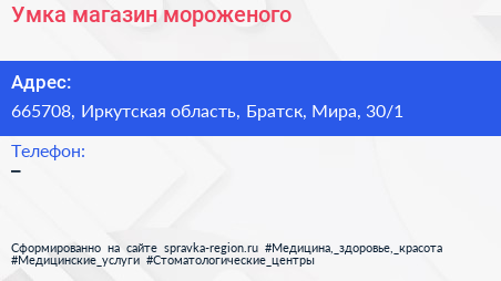 Умка, магазин мороженого по адресу 665708, Иркутская область, Братск, Мира, 30/1 в дальнейшем Организация, размещена в следующих категориях: